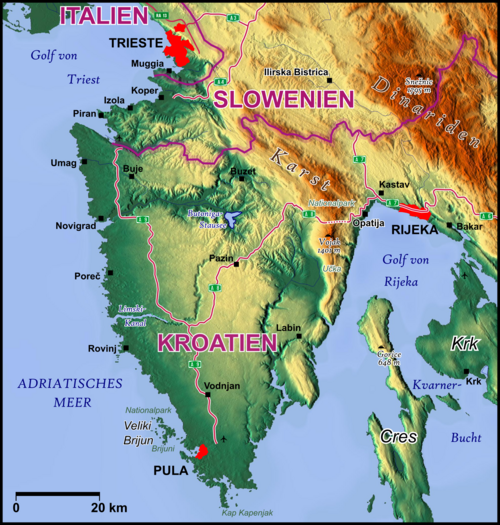 Istrien grenzt an Italien und Slowenien und ist geprägt von einer abwechslungsreichen Küstenlinie, sanften Hügeln, Weinbergen, Olivenhainen und dichten Wäldern. Die Region teilt sich grob in Küstenistrien und das ruhigere, ländliche Zentralistrien.